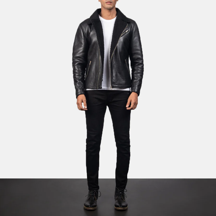This Men’s Alberto Black Shearling Leather Jacket is the perfect blend of rebellious attitude and cozy comfort. Crafted from genuine leather, the jacket is lined with soft, black shearling that offers exceptional warmth and a touch of luxury. The classic asymmetrical front zipper and wide notched collar create a bold, timeless biker silhouette, while the plush lining ensures you stay comfortable in colder weather. It’s the ultimate jacket for those who want a piece that’s both stylish and practical.