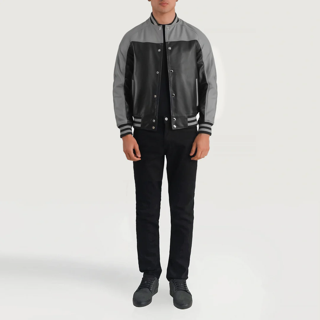 The Men’s Maverick Black & Grey Leather Varsity Jacket offers a sharp, contemporary take on the timeless athletic silhouette. The jacket’s body is crafted from rich, genuine black leather, while the shoulder yoke and sleeves are made from a contrasting, smooth grey leather, creating a dynamic, two-tone effect. The classic striped ribbed collar, cuffs, and hem complete the authentic varsity look, making this jacket a standout piece for modern streetwear.