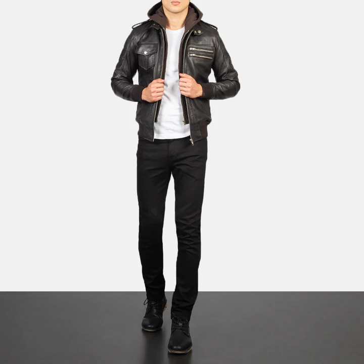 The ultimate hybrid of classic flight jacket style and modern comfort. This Brown Leather Hooded Bomber Jacket features a genuine leather shell, a detachable contrasting fabric hood, a ribbed hem and cuffs, and functional chest pockets for a rugged yet casual look.