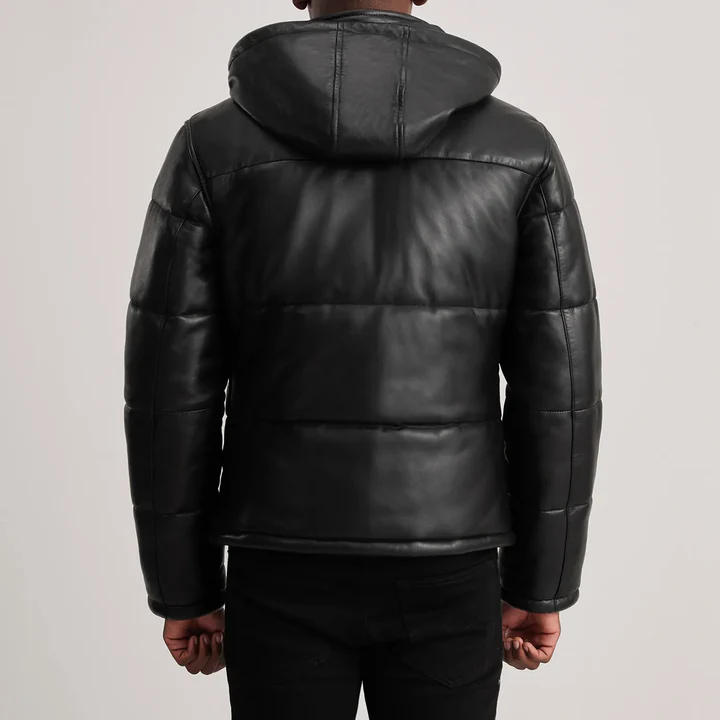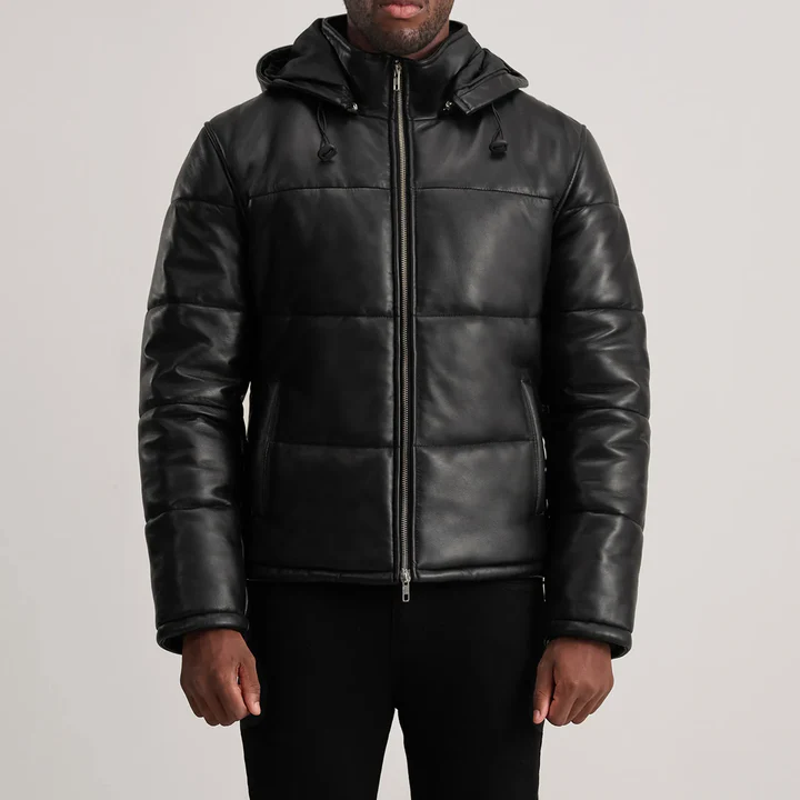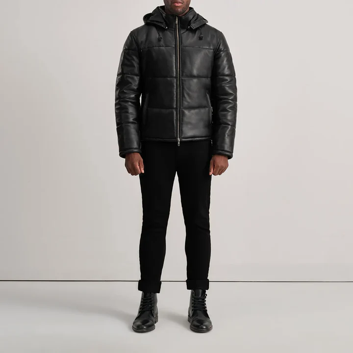 Luxury Insulation for Urban Winters The Men’s Black Leather Hooded Puffer Jacket is the ultimate solution for cold weather, transforming the bulky puffer into a sophisticated piece of outerwear. Made from smooth genuine black leather, the jacket offers a clean, semi-gloss finish that instantly elevates the look compared to nylon puffers. The leather is horizontally quilted in wide baffles, securely holding the insulation and providing exceptional core warmth.