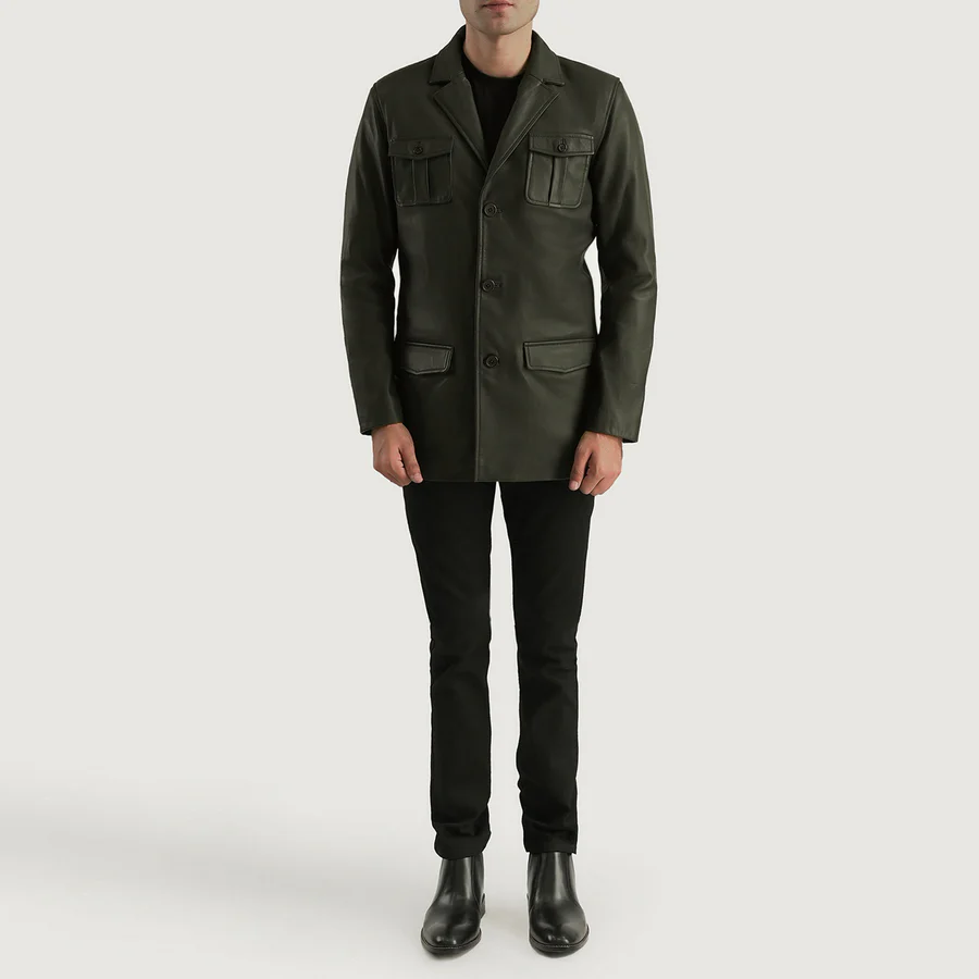The Men’s Dark Green Leather Blazer is the ultimate fusion of modern style and timeless sophistication. Crafted from smooth, genuine leather, its rich dark green color offers a unique and confident alternative to a traditional blazer. The tailored fit, classic button-down front, and notched lapels create a sharp silhouette, while the two large flap pockets add a functional, modern detail. It’s the perfect jacket to elevate a simple T-shirt and jeans or to make a bold statement over a button-down shirt.