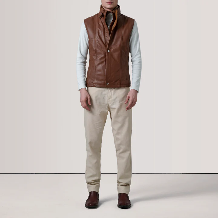 - Style: Trucker/Moto-inspired vest with a band collar.
